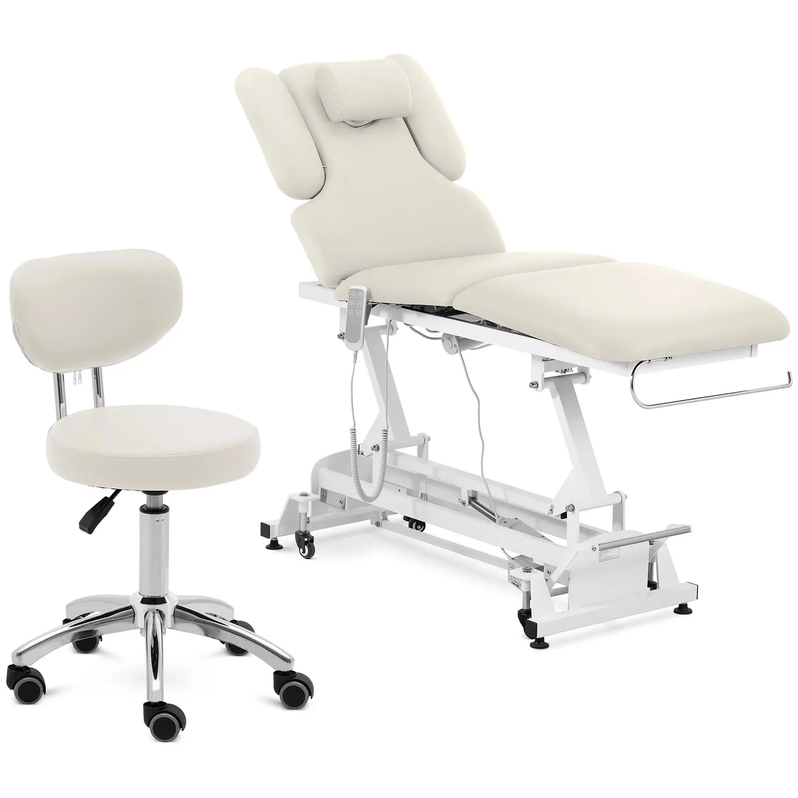 Specjalnie dla fizjoterapeutów, masażystów lub kosmetyczek. Łóżko do masażu z regulacją wysokości marki physa jest idealnym wyposażeniem gabinetu, studia, a nawet obiektów SPA lub wellness. Specjalna konstrukcja, różne funkcje, takie jak regulowany kąt nachylenia oparcia oraz kryteria ergonomiczne są idealnie dopasowane do potrzeb zarówno klienta, jak i terapeuty. Relaks i przyjazne dla pleców zabiegi są tu gwarantowane. Stół do masażu charakteryzuje się bardzo mocną konstrukcją o dobrej stabilności i wyposażony jest w pilot zdalnego sterowania wraz z uchwytem, a także wieszakiem na rolkę papieru. Dopasowane kolorystycznie krzesło kosmetyczne zapewnia odpowiedni komfort podczas pracy.
